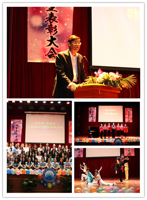 本次表彰大会共分教师和学生两个板块五个环节,对2014-2015年度外国语学院师生,在教育教学、人才培养、精神文明建设及各类学科技能竞赛等方面表现突出的优秀团体和先进个人予以表彰。表彰过程中还穿插了由师生带来的歌曲演唱、武术表演、诗歌朗诵等文艺节目。师生欢聚一堂,现场气氛活跃,别开生面的表彰大会在师生同唱《明天会更好》的歌声中落下帷幕。