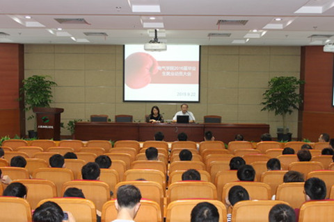 为更好地推进2016届毕业生就业工作,9月22日下午,电气学院在校图书馆B101召开了2016届毕业生就业动员大会,电气学院党总支书记徐兵,党总支副书记、副院长胡婷、毕业班辅导员王晨义和200多名毕业生出席了此次动员大会。
