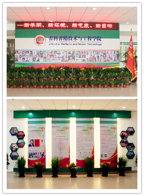 开学伊始,当师生们走进香料学院大厅,一套全新、完整的形象装置和宣传图文映入眼帘,令人耳目一新。位于正前方的形象装置顶天立地,顶部的LED清晰地滚动显示“新学期、新环境、新气象、新目标”,表达出香料师生的共同心声与追求;立体的蓝色院名、多色院标以黄金分割比镶贴在绿白相接的背景墙上,三色对比之下显得格外醒目;由学院所有员工的灿烂笑脸组成的笑脸墙以画轴形式呈现,位于整个装置的中间,高度恰与人们视线持平,亲和、温馨之感油然而生;三层不同品种和高度的绿化盆栽,从地面向上形成坡度;“香料人欢迎您”六个大字,以45度仰角前后高低错落有致地安插在绿化丛中,形成强烈的3D视觉效果;制作精良的功勋院旗肃然地矗立在装置的右侧,庄重而自信。