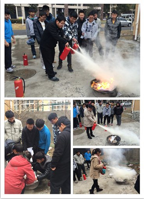 班委进行了消防知识宣传,如自然灾害下如何逃生,如何保护自己等;讲解了灭火要点,包括灭火器的种类,使用方法,姿势,以及如何保存等。为了让同学们学习消防、灭火的具体知识,还进行了实地演练。在室外将消防桶内放可燃物点燃,由专业人士示范如何拔出保险销使用灭火器灭火,同学们依次在专业人士指导下正确使用灭火器。