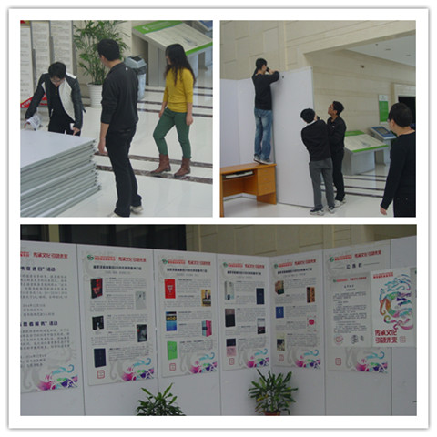 在学校图书馆一年一度的“读者服务月”举办前夕,图书馆一楼大厅的服务月展示布展工作正在有条不紊地进行着。本次布展工作的不同之处在于现场工作的人员不是某家公司的员工,而是我校经济与管理学院会展专业的师生们,他们用自己的专业知识和技能,为图书馆读者服务月的信息传播搭建起了专业的展示平台。