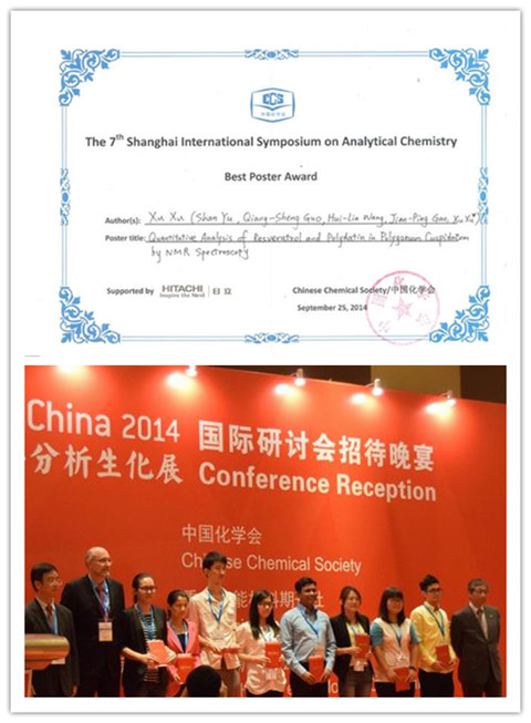 我校化工学院师生首次参加此类国际盛会,并取得优异成绩。许旭教授应邀作口头报告,其指导的研究生禹珊的课题“Quantitative Analysis of Resveratrol and Polydatin in Polygonum Cuspidatum by NMR Spectroscopy”获第七届上海国际分析化学研讨会优秀墙报奖。