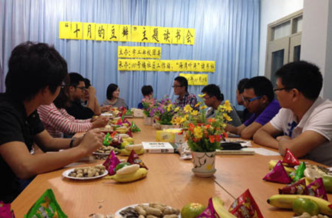 10月3日晚,为欢度国庆、丰富留校学生的节日生活,计算机学院10号社区建设工作站携手我校“海湾听涛”读书社共同举办了“十月的豆瓣”主题读书会。团委、社区建设工作站指导老师会同部分假期留校同学在10号楼阅读吧共品书香,为祖国庆生。