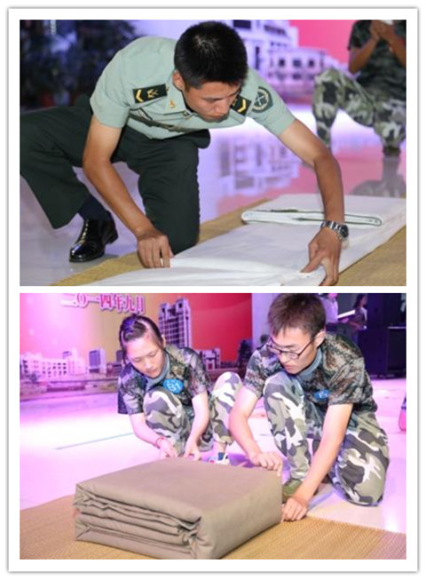 伴随着振奋人心的暖场军歌,比赛正式拉开帷幕。各学院派两组选手参赛,每组由一男一女两名选手组成,大赛分两轮进行,赛时三分钟。只见选手们迅速将被子压平、对折、切槽、起角……按照平日里教官教的方法一步步熟练地整理着被子,表情认真而兴奋。娴熟的动作,熟练的操作技巧赢得了同学们的阵阵掌声,整个赛场紧张热烈、热火朝天。比赛结束,场上也呈现出一个个整整齐齐、有棱有角的“豆腐块”。