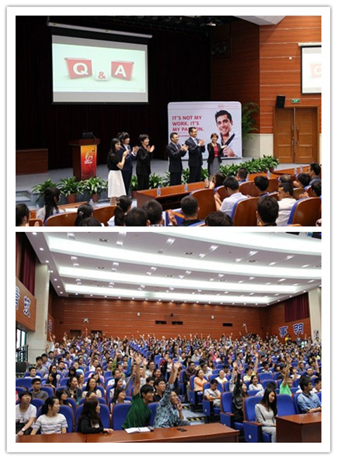 活动中还穿插了很多有奖问答和现场提问互动环节,同学们热情高涨、积极互动提问,期间更有三位幸运儿因出色的提问而获得了汉高2015招聘的绿色通道。最后,宣讲会在全场热烈的掌声中圆满落幕。