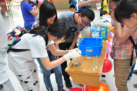 在化工学院展区,集奇幻的化学实验、火辣的文艺表演和充满挑战的趣味游戏于一体,将科学奥秘与体育游戏有机结合起来,吸引了许多同学。特别是化学实验区,一个个有趣的化学实验,一次次耐心的讲解,使枯燥无味的化学呈现出了别样的魅力,从“大象牙膏”到“水中花园”,无不引得同学们驻足观看,拍手叫绝。