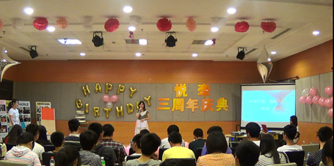 5月28日,全体悦牵成员在大学生活动中心103教室还举办了“时光不老、悦牵不离”三周年庆典晚会。晚会充满欢声笑语,感人的视频、精彩的表演、热闹的游戏、别具一格的祝福拉近了同学间的距离,使“悦牵”成为一个和谐的大家庭。