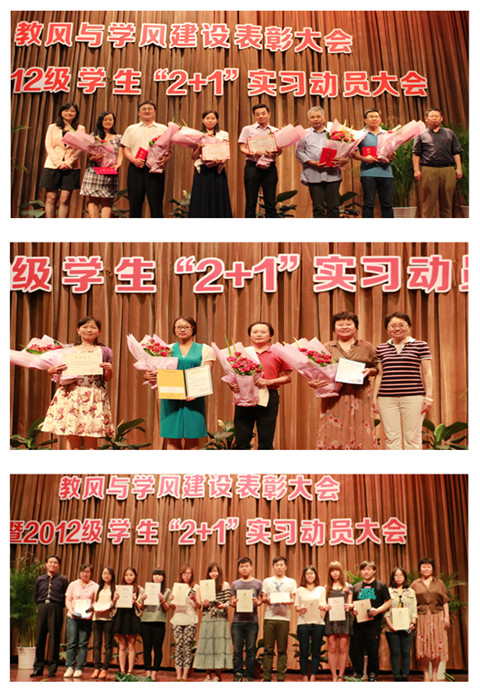 大会首先表彰了“明星教师”和“星级教师”。为鼓励优秀教师更好地教书育人,高职学院自2012年起通过学生评教方式,每学期产生一届明星教师。经管学院李琳、化工学院吴锡惠、外语学院尹国梁、高职学院林娟娟、我校退休教师居环龙、高职外聘教师刘有缘荣获高职学院第三届“明星教师”称号。机械学院的丁晓影老师和经管学院的洪静老师因两次荣获明星教师称号,并在本次学生评教中再次名列前茅,被授予首届“星级教师”称号。