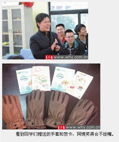 于是,楼委会悄悄行动起来。他们绞尽脑汁,最后决定买保暖手套。“阿姨们成天为我们操劳,一双手已经磨得很粗糙了,大冬天的还要骑电瓶车,保暖手套最能代表我们的心意,我们希望阿姨们在提醒我们注意保暖时,也能自己多保重身体。”王俊友说。
