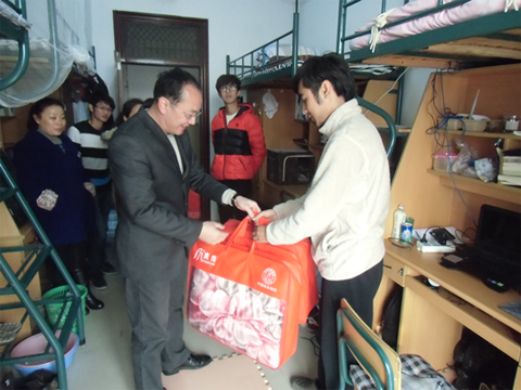 12月6下午,电气学院党总支书记徐兵、副书记胡婷和学院辅导员走访了学生宿舍,慰问学院2013级困难学生,并送上了毛毯、床垫、保暖内衣等御寒慰问品,让学生在严冬里感受了学校和学院送出的阵阵暖意。