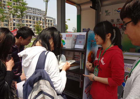 此次大型图书漂流活动首次在上海高校发起,我校作为5所首批试点学校之一。4月26日中午,我校志愿者服务亭迎来了“信用起航”图书漂流活动的开港首漂,图书漂流站书架上摆放了适合青年阅读的图书,涉及文化、职场、励志等方面。