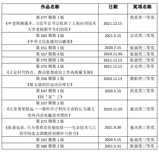 获得一等奖的作品是由轨道交通学院党总支书记李文举撰写的消息类稿件《中老铁路通车,习近平总书记收到了上海应用技术大学老挝留学生们的信》,其他奖项分别是版面类5项、言论类2项、摄影类1项、通讯类2项和消息类1项,涵盖了每个参评类别。