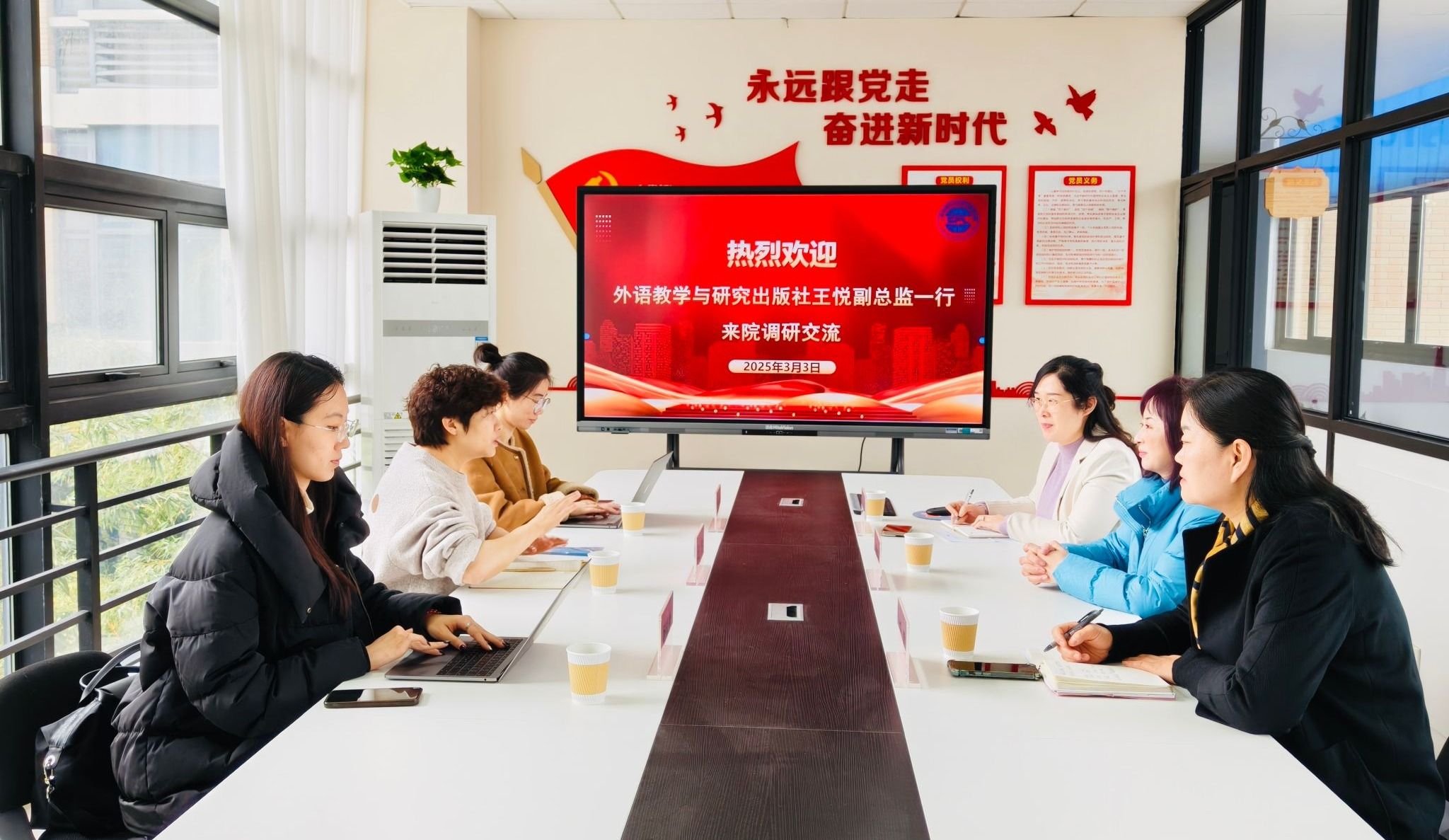 3月3日,外语教学与研究出版社副总监王悦一行来访外国语学院,就深化双方在课程建设、教学改革、教学平台使用等方面进行合作探讨。外国语学院党委副书记、院长潘智丹、党委书记杨雪参会交流研讨。