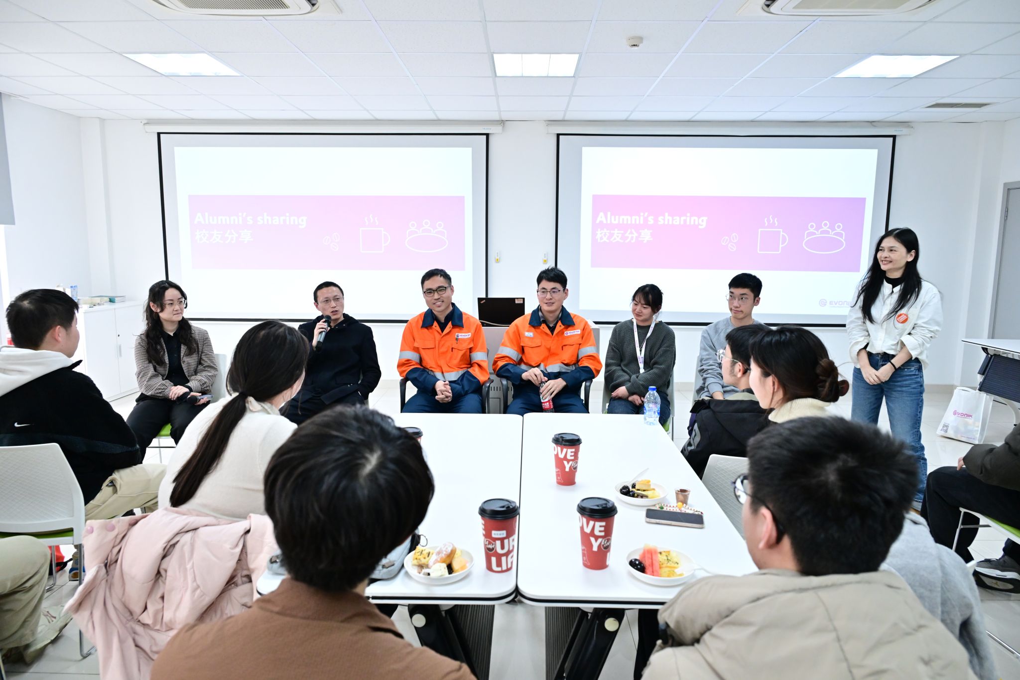 在职业分享会上,多位任职于赢创的校友结合自身经历,剖析了化工人才的核心竞争力与发展路径。王玥博士以"从校园到职场"为主题,建议学弟学妹们夯实专业基础的同时培养跨学科思维;工程师王晨旭则强调:"化工行业正加速向低碳化转型,掌握绿色工艺技术将成为职业发展的关键优势。"问答环节中,同学们围绕职业规划、国际认证等话题踊跃提问,现场气氛热烈。