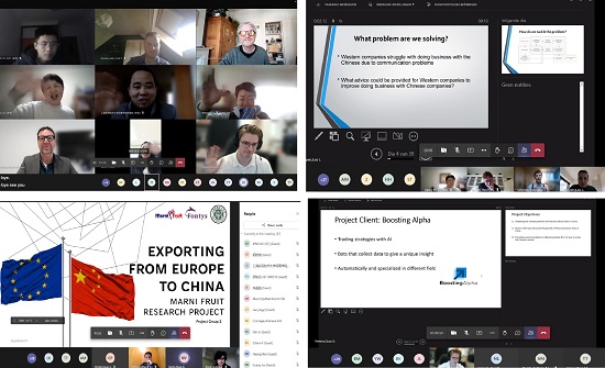 汇报中,两校学生对各自研究作了细致阐述。第一小组以“Comparing Two Smart Cities”为项目主题展开一系列调研,通过问卷、采访、查阅资料等形式,多角度了解中国公司与欧洲公司之间的外贸情况,提出建议。第二小组围绕“荷兰与中国之间的蔬果贸易”主题,就国外贸易商如何与中国进口商进行合作展开一系列调研,通过采访、查阅资料等形式,多方面了解外贸商所需要持有的相关法律证明、沟通渠道、中国进口商喜好等相关问题。第三小组就Boosting Alpha B.V公司开发基于AI的智能机器人投资顾问展开一系列调研,多角度探讨国内外智能机器人投资顾问发展情况,以及Boosting Alpha B.V公司想要进入中国市场需要采取哪些准备。