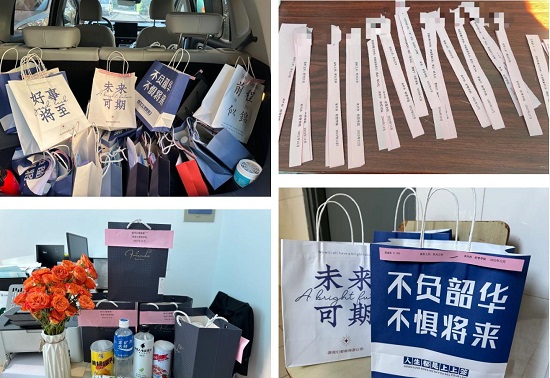 为了不打扰考研同学专心复习,也为了同学们的安全考虑,辅导员老师们挨门挨户将”盲盒“礼袋送到了学生宿舍门口,完成了无接触配送。在特别时期,将特别的爱,以特别的方式,送给特别的考研学生们。