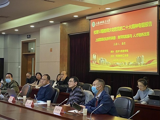 12月9日下午,由党委教工部主办、经济与管理学院承办的校第53期教师沙龙暨学习党的二十大精神专题报告会举行,上海外国语大学国际工商管理学院院长潘煜教授应邀作专题报告《商学院发展与人才培养改革》,经管学院班子成员及全体教职工参加。学院院长熊焰主持。