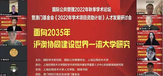 近日,沪澳学术机构联办国际公共管理2022年秋季学术论坛暨澳门基金会《2022年学术项目资助计划》人才发展研讨会,研讨会由国际学术研究院、国际公共管理学会、上海应用技术大学主办,我校国际学术研究院共建世界重要人才中心和创新高地研究院承办。国际学术研究院青年委员会主任陈家豪、刘弘烨主持。我校人文学院院长、国际公共管理学会会长张向前,国际学术研究院院长高胜文等出席。