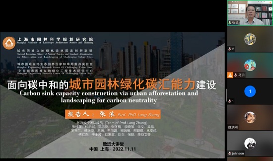 张浪从当前全球气候变化与“碳中和”时代背景入手,分析了城市园林绿化碳中和的潜力与相关政策制定的依据,系统性阐述了城市园林绿化碳汇能力的建设进展;以推动高质量城乡园林绿化建设发展为抓手,创新绿色低碳发展规划编制与城市生态网络系统格局方法、研发城市更新地区园林绿化修复提升与高效营建技术、创建城市森林碳汇检测评估体系、构建城市与区域一体化生态环境管控体制机制。他介绍了其团队面向碳中和的科技创新成果,包括上海市基本生态网络总体布局、城市生态廊道链接度提升机制、城市困难立地园林绿化高效营建等有关研究,推动城市生态环境决策支持与一体化管理。他就如何进一步提升城市园林绿化碳汇能力,分享了在认知、战略、进程、技术上的思考。