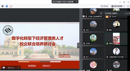 近日,经管学院线上举办“数字化转型下经济管理类人才校企联合培养研讨会暨2022年校企合作年终总结座谈会”,企业专家代表,经管学院院长熊焰、党委书记侯建生等班子成员及各系主任、副主任,部分骨干专业老师参加研讨会。副院长于本海主持。