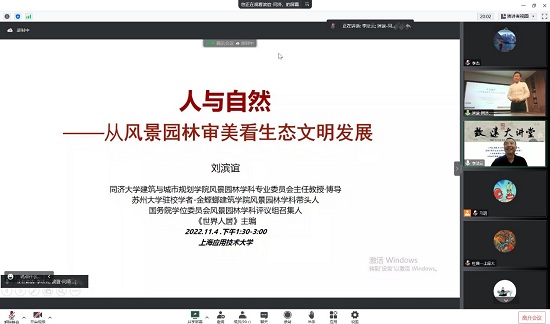 讲座围绕“人与自然”主题展开,刘滨谊深入浅出地讲解了建设人与自然高度和谐共生的现代化意义与必要性,分析为什么中国风景园林始终走在人与环境互动的最前沿,引领人与自然的精神文明进步。他结合自身在新疆等地开展考察与风景园林相关规划的经历感悟,阐述了风景园林由理论到实践的过程以及人与生存环境的关系,系统讲解了中国园林所蕴含的生态文明哲学观念意识、风景园林学科三轴六向全域理论与应用拓展体系。讲座最后,他寄语上应青年学子要勇担新使命、应对新变化,辩证地看待传统园林文化,顺应时代需求,坚守中国风景园林人与自然和谐共生的伟大理念,为风景园林始终喝彩,积极投身于伟大的新时代。