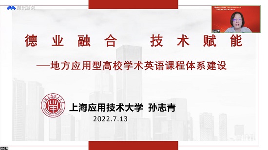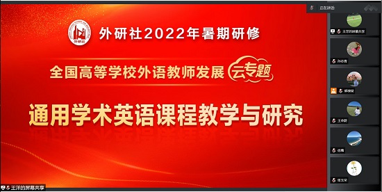 全国高等学校外语教师发展云专题是外语教学与研究出版社举办的2022年度暑期全国外语教师“云研修”活动,“通用学术英语课程教学与研究”是其系列专题之一。孙志青作为我校代表,与来自中国科学院大学、中国人民大学、华南理工大学、华北电力大学等高校代表齐聚线上,围绕学术英语课程建设与教学实践展开研讨和交流,展示了我校大学英语教学改革的丰硕成果。