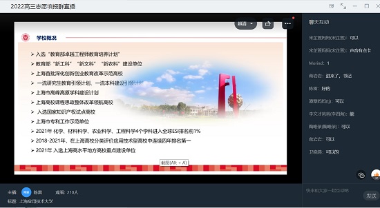 陈雷从学校概况、学科科研、人才培养、国际交流、学生考研就业等方面,对学校发展特色及综合实力作了推介。蒋岩岩从近年学校整体生源质量、上海考生录取分数及排名、上海招生计划及招生政策、报考建议等作了介绍。王凤超线上积极与中学师生进行互动,并答疑解惑。