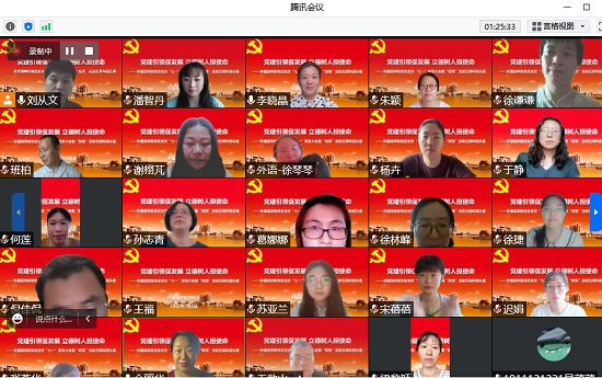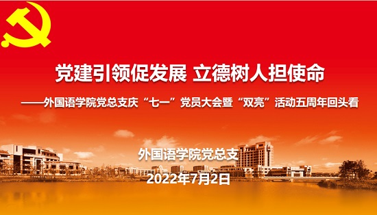 为庆祝中国共产党成立101周年,7月2日,外国语学院党总支线上举行“党建引领促发展·立德树人担使命——庆‘七一’全体党员大会暨‘双亮’活动五周年回头看”主题党日活动,学院党总支书记李晓晶,院长潘智丹,党总支副书记、副院长金丽华,副院长孙志青及全体师生党员参加。活动由金丽华主持。