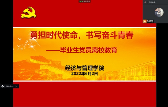 近日,经管学院线上举行“勇担时代使命 书写奋斗青春”2022届毕业生党员离校教育活动,学院党委书记侯建生,党委副书记、副院长朱菁及毕业年级党支部书记、全体毕业生党员参加。