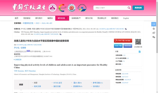 疫情期间,体教部科研工作不减缓。尹小俭带领部门青年教师团队在北大核心期刊《中国学校卫生》发表专栏文章。此专栏全部为团队聚焦青少年体力活动健康教育领域的阶段性研究成果。