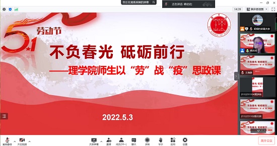 日前,理学院结合“劳动教育周”,开展以“劳”战“疫”大思政课,学院党政班子成员、教师代表、全体辅导员、全体学生共400余人参加,学院党委副书记、副院长蒋岩岩主持。