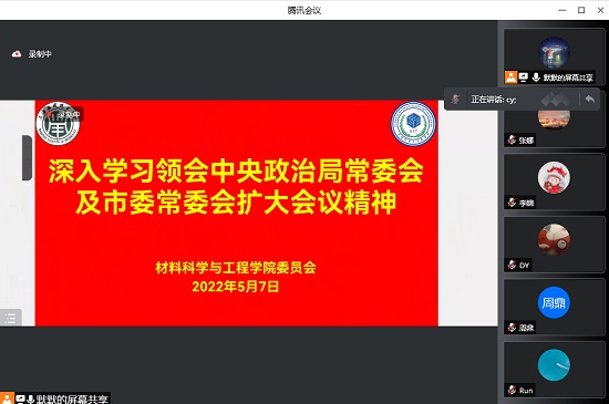 5月7日,材料学院线上召开学院党委会议,深入学习领会中央政治局常委会精神及市委常委会扩大会议精神。学院党委委员参会,党委书记陈勇主持并领学。会上,与会人员认真学习了中央政治局常委会精神及市委常委会扩大会议精神,学习了校党委书记郭庆松在《解放日报》所刊发的《打赢大上海保卫战,信心和底气从何而来》一文。