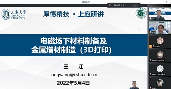 王江以“电磁场下材料制备及金属增材制造(3D打印)”为主题,围绕“我们为什么要做这个事”、“我们做的事情能用在哪里”和“这个事情的研究基础如何”等方面,讲述了磁场调控的金属凝固过程及其可视化、磁场控制增材制造(3D打印)、金属构件凝固组织等研究。他把育人元素融入学术报告中,表示当代研究生不仅要做好研究,更要学做人、做好人,要从多个维度、科学地看待事情,保持不偏不倚的客观态度。