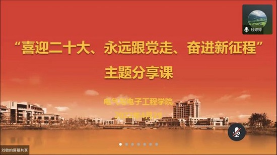4月29日晚,电气学院分党校举行“喜迎二十大、永远跟党走、奋进新征程”主题分享课活动,学院党委副书记钱婷婷主持,学院各支部书记和全体分党校学员参加。