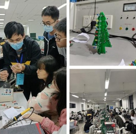 比赛中,大学生科技创新协会工作人员布置场地、准备培训器材。在指导老师指导下,培训人员向学生们介绍如何正确使用电烙铁及注意事项,并手动焊接实地展示操作方法。随后讲解“电子琴”、“圣诞树”、“抢答器”等的基本结构及各部分功能,指导学生分辨不同色环电阻、二极管以及三极管等元器件的功能以及焊接方式。讲解结束后,培训人员开始进行实践操作,并为学生答疑解惑。随后,学生们以寝室为单位,大展身手,在制作作品过程中,发挥自己的动手创作能力和团队合作精神。最后,大赛评出一、二、三等奖。