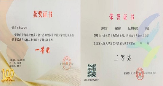 日前,我校人文学院唐存才副教授指导学生倪家樾创作的书法作品《山居秋暝》,获教育部主办的全国第六届大学生艺术展演活动艺术作品甲组二等奖,同时获上海市教委主办的全国第六届大学生艺术展演上海市活动艺术作品类书法一等奖。