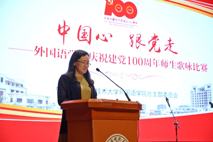 红歌嘹亮,激情飞扬,外国语学院“中国心 跟党走”庆祝建党100周年歌咏比赛日前在大学生活动中心小礼堂举行。校党委副书记、副校长王瑛出席并致辞。