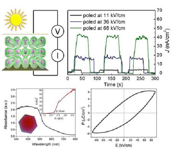 据悉,铁电材料在新型太阳能电池、光电探测器和光电存储器等方面拥有巨大的应用前景。与传统半导体太阳能电池中的p-n结或肖特基结不同,铁电材料的本征极化构建的内部电场可作为光电效应的驱动力,不仅有助于光生载流子的分离和迁移,而且可以大幅节省太阳能电池的制造成本。但传统铁电材料的带隙宽度一般都高于3.0 eV,且目前已知的窄带隙铁电材料大多含有挥发性元素(Bi、Pb、K等)或热稳定性差(无机有机杂化钙钛矿、分子铁电体等),不含挥发性元素且具有窄带隙和优良光电性能的铁电材料仍然稀缺。