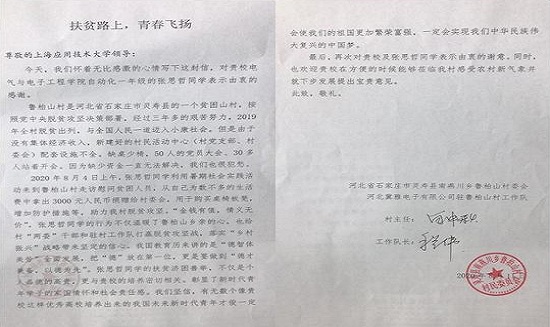 日前,电气学院收到一封来自河北的感谢信,对学院张思哲同学的暑期社会实践活动表示感谢。