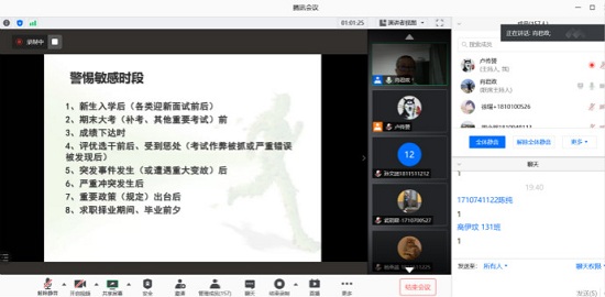 培训从心理危机的概念与特点导入,详细介绍了心理危机的发生、发展和后果,着重分析了大学生常见的心理危机类型、产生原因及外部表现,为班级心理委员发现和识别常见心理危机提供技术指导。培训明确了班级心理委员在心理危机处理过程中的职责及实施要点,并强调了班级心理委员“可做”“要做”与“不做”,更细致地指导班级心理委员开展工作。