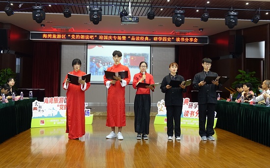 “党的朗读吧”是人文学院与海湾旅游区党工委于2017年共同设立的党建联建品牌项目,旨在传承红色文化,弘扬红色精神。本次系列活动在前期各单位选送节目的基础上,选出7个优秀作品集中展示。海湾旅游区基层党组织代表们分享了《光荣老太吴慧珍的故事》、《细节的力量——新中国的伟大实践》、《伟大的开端》、《苦难辉煌》等篇章的读书体会,人文学院学生展示了经典作品《可爱的中国》,将朗诵与感悟、交流融合贯通,用声音缅怀历史,用声音传递力量。