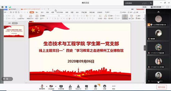 为更深入地进行“四史”学习教育,生态学院在疫情防控常态化背景下,创新党员教育工作新途径,围绕“改革开放史”,9月6日,生态学院“四史”暑期社会实践“星火队”采取线上直播方式,为学院学生第一党支部直播参观柳州工业博物馆,支部书记邢敏主持。