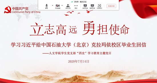 7月14日晚,人文学院学生第一党支部、第二党支部联合开展线上“四史”学习教育主题党日暨毕业生党员离校教育活动,支部全体党员、部分学生代表参加。