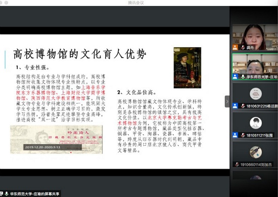 庄瑜以卢浮宫为例展开讲述,介绍了公元前280年古埃及亚历山大博物馆(最早的博物馆)、1683年牛津大学阿什莫林博物馆(第一个高校博物馆)、1946年国际博物馆协会以及中国的博物馆——徐家汇博物馆、京师同文馆博物馆、南通博物苑等,阐述了博物馆的兴起与发展。庄瑜表示,高校博物馆不同于一般的综合型博物馆,并着重介绍了京师同文博物馆、南通大学现代教育技术博物馆和陕西师范大学教育博物馆,以及它们在“文化自信”教育中的功能,表示文化兴国运兴,文化强民族强,以高效博物馆为依托,进行文化育人。庄瑜总结了高校博物馆的文化育人优势:专业性强、文化品位高、爱国情怀深;高校博物馆的美育优势:传承文化价值、涵养文明育人价值、树立正确历史观、树立理想信念的榜样。