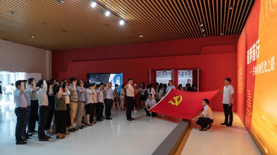 活动首先参观了在奉贤区博物馆举办的“追梦前行——共和国现代化之路”展览,作为“四史”教育的生动教材,党员们通过参观,真切感受和认识到新中国现代化的历程与成就,家国情怀被充分激发。参观结束后,两家单位全体党员面向党旗重温了入党誓词,再一次坚定了共产主义的信仰,明确了新时代赋予自己肩上的责任。