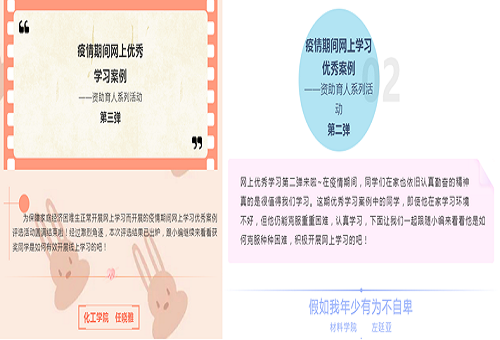 疫情期间,校资助管理中心根据上海应用技术大学“三全育人”综合改革方案文件精神,为更好发挥资助工作的育人成效,开展了校家庭经济困难学生疫情期间网上学习优秀案例评选活动。在校内共评出20位疫情期间网上学习优秀案例。其中,经学校初选申报、专家集中评审,肖璐艺等4名同学获得上海市学生事务中心主办的疫情期间网上学习优秀案例。同时,为表彰上应学子积极进取、拼搏奋斗的先进典型,深入挖掘、宣传他们的先进事迹与成功经验,充分发挥优秀学生的榜样引领作用,引导和激励广大青年敢于有梦、勇于追梦、勤于圆梦。学校开展了2018-2019年度“校园先锋”评选活动。终评会通过线上评审进行,并评出十名“自强之星”。