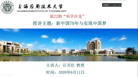 6月11日,由机械学院组织承办的学校第22期“明学沙龙”在线举行,沙龙主题为“新中国70年与实现中国梦”,上海师范大学马克思主义学院教授、思想政治教育研究所所长、博士生导师石书臣教授应邀担任主讲。