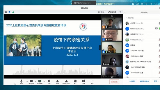 6月2日,校党委学工部心理健康教育中心开展2020年班级心理委员战疫专题继续教育培训,首场培训邀请上海学校心理健康教育发展中心主任李正云教授开讲《疫情下的亲密关系》。复旦大学、同济大学和上海大学等27所上海高校教师、我校各学院心理辅导员和全体2017级、2018级班级心理委员共200余人通过在线方式参与,培训由我校党委学工部副部长牛亏环主持。