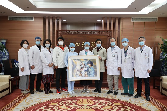 我校城建学院教师蔡亚鸣根据临别之时“临时妈妈”们争相抱抱宝宝的场景,创作了水彩画《最小病人治愈一城人心》。在复旦大学上海医学院党委副书记张艳萍带领下,蔡亚鸣于3月13日下午将画作捐赠至复旦大学附属儿科医院。复旦大学附属儿科医院党委书记徐虹、院长黄国英热情接待蔡亚鸣,并感谢他对抗“疫”一线的医护人员的艺术描绘。在捐画现场,蔡亚鸣亲手将画作赠予“画中人”——复旦大学附属儿科医院传染科主任曾玫和护士长夏爱梅。画面中,上海最小的新冠肺炎患者,7月龄的宝宝齐齐(化名)穿着白色的连体衣,戴着小口罩,被抱出复旦大学附属儿科医院传染科大楼。“让我再抱抱!”传染科主任曾玫最后抱了一下齐齐,夏爱梅手中则拿着齐齐最喜欢的玩偶。“临时妈妈”们慈爱地告别这位最小患者,目送齐齐和爸爸妈妈离开医院。看到画中的自己,两位白衣天使爱不释手,连称“画得传神”。