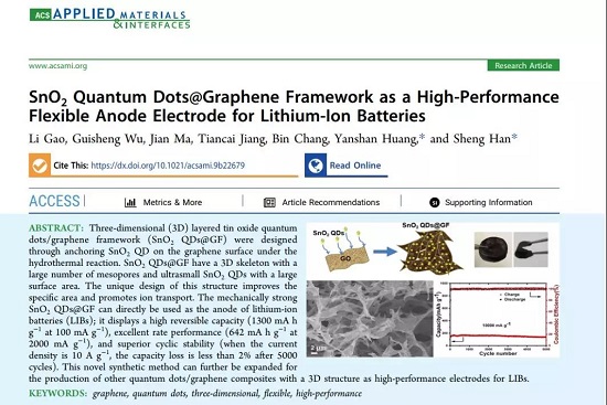 青年教师黄燕山指导的17级研究生高丽以二氧化锡量子点为活性材料,高导电性的三维石墨烯作为骨架,成功制备了二氧化锡量子点石墨烯复合柔性锂离子电极负极材料,研究发现,三维石墨烯结构,不但可以有效提高活性材料二氧化锡量子点的导电性,同时还可为复合材料提供柔性骨架结构,直接构筑成无粘结剂柔性锂离子电池负极材料。该工作以题为“SnO2 Quantum Dots@Graphene Framework as a High-Performance Flexible Anode Electrode for Lithium-Ion Batteries”的论文发表在材料领域国际知名期刊ACS Applied Materals & Interfaces(一区,IF 8.456) 上。这项工作对开发高性能的二氧化锡基柔性电极材料具有重要的意义。